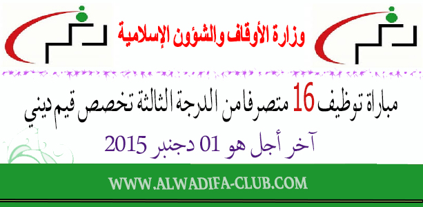 تنظم، بتاريخ 7 دجنبر 2015، بمقر وزارة الأوقاف والشؤون الإسلامية، الكائن بالمشور السعيد بالرباط، عملية لانتقاء قيمين دينيين مكلفين، ممن يزاولون مهمة الإمامة أو مهمة الإمامة والخطابة، للتعاقد معهم بصفتهم قيمين دينيين متعاقدين.